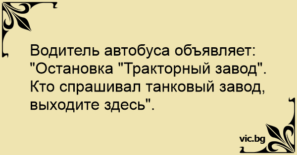 Водитель автобуса объявляет: "Остановка "Тракторный завод". Кто спрашивал танковый завод, выходите здесь".