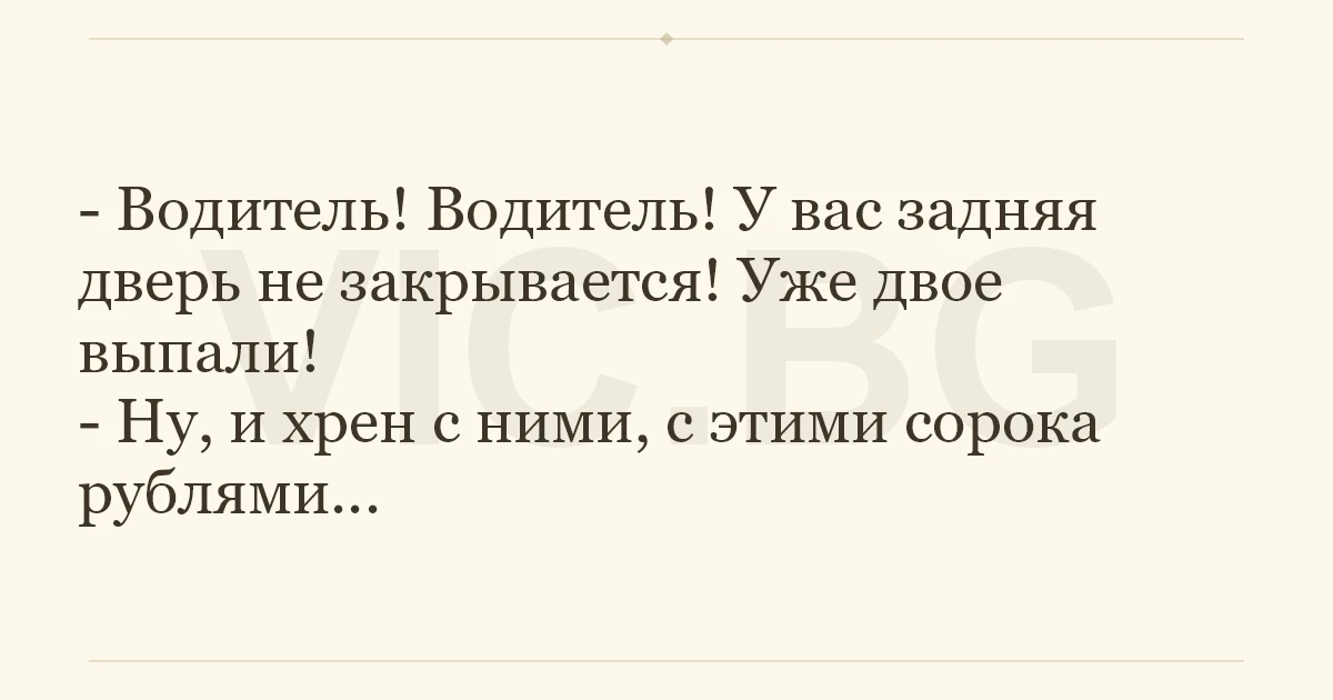- Водитель! Водитель! У вас задняя дверь не закрывается! Уже двое выпали!<br />- Ну, и хpeн с ними, с этими сорока рублями...