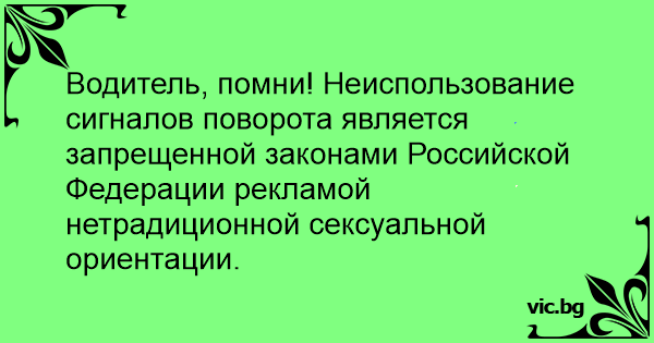 Водитель, помни! Неиспользование сигналов поворота является запрещенной законами Российской Федерации рекламой нетрадиционной сексуальной ориентации.