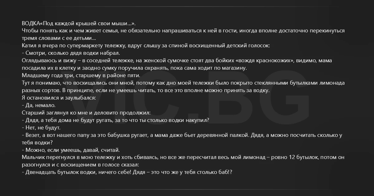 ВОДКА«Под каждой крышей свои мыши…». Чтобы понять как и чем живет семья, не обязательно напрашиваться к ней в гости, иногда вполне достаточно перекинуться тремя словами с ее детьми… Катил я вчера по супермаркету тележку, вдруг слышу за спиной восхищенный детский голосок: - Смотри, сколько дядя водки набрал. Оглядываюсь и вижу – в соседней тележке, на женской сумочке стоят два бойких «вождя краснокожих», видимо, мама посадила их в клетку и заодно сумку поручила охранять, пока сама ходит по магазину. Младшему года три, старшему в районе пяти. Тут я понимаю, что восхищались они мной, потому как дно моей тележки было покрыто стеклянными бутылками лимонада разных сортов. В принципе, если не умеешь читать, то все это вполне можно принять за водку. Я остановился и заулыбался: - Да, немало. Старший заглянул ко мне и деловито продолжил: - Дядя, а тебя дома не будут ругать, за то что ты столько водки накупил? - Нет, не будут. - Везет, а вот нашего папу за это бабушка ругает, а мама даже бьет деревянной палкой. Дядя, а можно посчитать сколько у тебя водки? - Можно, если умеешь, давай, считай. Мальчик перегнулся в мою тележку и хоть сбиваясь, но все же пересчитал весь мой лимонад – ровно 12 бутылок, потом он разогнулся и с восхищением в голосе сказал: - Двенадцать бутылок водки, ничего себе! Дядя – это что же у тебя столько баб!?
