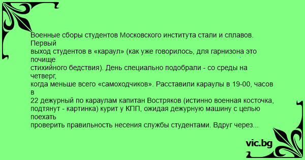 Военные сборы студентов Московского института стали и сплавов. Первый выход студентов в «караул» (как уже говорилось, для гарнизона это почище стихийного бедствия). День специально подобрали - со среды на четверг, когда меньше всего «самоходчиков». Расставили караулы в 19-00, часов в 22 дежурный по караулам капитан Востряков (истинно военная косточка, подтянут - картинка) курит у КПП, ожидая дежурную машину с целью поехать проверить правильность несения службы студентами. Вдруг через забор со стороны казарм (где часовых нет) перемахивает солдатик с целью перебежать улицу и, перемахнув другой забор, оказаться в расположении автопарка (где стоят часовые-студенты). Капитан, представив реакцию этих самых часовых (Стой, стрелять буду! - Стою! - Стреляю!), естественно, орет: "Стой!" Солдатик, естественно, прибавляет ходу. Капитан бросается за ним. Солдатик прибавляет еще и уже цепляется за забор автопарка. Тогда капитан использует последний довод - с расстояния метров двадцать орет: "Mудak, там студенты!!!" Тут и до солдатика доходит. Уже с гребня стены он прыгает не в автопарк, а на улицу, падает на пятую точку, прикладывает руку к головному убору и жалобно говорит капитану: - Простите, забыл! … Из-за забора автопарка поднимается фигура студента в шинели не по росту, но с автоматом наизготовку … БВВ (Бризантное взрывчатое вещество)