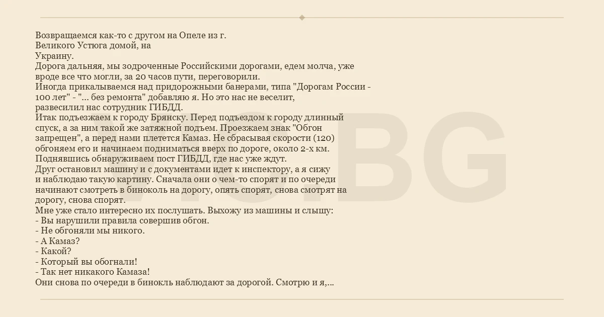 Возвращаемся как-то с другом на Опеле из г. Великого Устюга домой, на Украину. Дорога дальняя, мы зодроченные Российскими дорогами, едем молча, уже вроде все что могли, за 20 часов пути, переговорили. Иногда прикалываемся над придорожными банерами, типа "Дорогам России - 100 лет" - "... без ремонта" добавляю я. Но это нас не веселит, развесилил нас сотрудник ГИБДД. Итак подъезжаем к городу Брянску. Перед подъездом к городу длинный спуск, а за ним такой же затяжной подъем. Проезжаем знак "Обгон запрещен", а перед нами плетется Камаз. Не сбрасывая скорости (120) обгоняем его и начинаем подниматься вверх по дороге, около 2-х км. Поднявшись обнаруживаем пост ГИБДД, где нас уже ждут. Друг остановил машину и с документами идет к инспектору, а я сижу и наблюдаю такую картину. Сначала они о чем-то спорят и по очереди начинают смотреть в биноколь на дорогу, опять спорят, снова смотрят на дорогу, снова спорят. Мне уже стало интересно их послушать. Выхожу из машины и слышу: - Вы нарушили правила совершив обгон. - Не обгоняли мы никого. - А Камаз? - Какой? - Который вы обогнали! - Так нет никакого Камаза! Они снова по очереди в бинокль наблюдают за дорогой. Смотрю и я, действительно никакого Камаза нет - испарился. Видно повернул на проселочную дорогу. Инспектор: - Я сам видел как вы обгоняли. - Так где твой Камаз? Давай остановим его и спросим, - говорит друг. - Не знаю где.. - Значит нет Камаза, нет и нарушения. - Так что, я вас зря останавливал? Все равно вы ехали очень быстро. - Сколько...? - Что сколько? - спрашивает сотрудник. Я уже ржал в открытую, а мента это уже начало бесить. - С какой скоростью мы ехали? - спрашивает друг. - Не знаю, у меня нет "Фары", но я видел что быстро. Раз так, то давайте посмотрим ваше снаряжение, - идут к машине. - Нет колпачков на колесах, - говорит сотрудник. - А на безопасность это влияеет? - спрашивает друг. - Нет, вообщем-то... , открывайте багажник. У вас канистра с бензином, а перевозка бензина запрещена! - Это солярка. - А огнетушителя-то нет! Я достаю огнетушитель из салона и говорю на украинском: "Ось вогнегаснык!" Мент ко мне: - Чего, чего ты сказал? - Вот огнетушитель - это по-украински, - отвечаю. - Вот там и умничайте, а здесь не нарушайте. - Так мы и не нарушаем. - Некогда мне тут с вами, езжайте. Садимся в машину и слышим: "Вот хохлы, ездют тут, нарушают, а потом умничают". Мы ржали до самой границы.