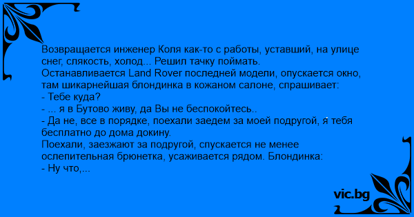 Возвращается инженер Коля как-то с работы, уставший, на улице снег, слякость, холод... Решил тачку поймать.