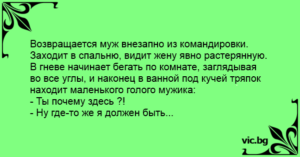 Возвращается муж внезапно из командировки. Заходит в спальню, видит жену явно растерянную. В гневе начинает бегать по комнате, заглядывая во все углы, и наконец в ванной под кучей тряпок находит маленького голого мужика: