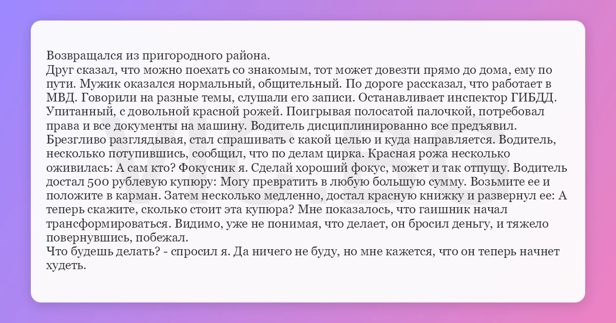 Возвращался из пригородного района. Друг сказал, что можно поехать со знакомым, тот может довезти прямо до дома, ему по пути. Мужик оказался нормальный, общительный. По дороге рассказал, что работает в МВД. Говорили на разные темы, слушали его записи. Останавливает инспектор ГИБДД. Упитанный, с довольной красной рожей. Поигрывая полосатой палочкой, потребовал права и все документы на машину. Водитель дисциплинированно все предъявил. Брезгливо разглядывая, стал спрашивать с какой целью и куда направляется. Водитель, несколько потупившись, сообщил, что по делам цирка. Красная рожа несколько оживилась: А сам кто? Фокусник я. Сделай хороший фокус, может и так отпущу. Водитель достал 500 рублевую купюру: Могу превратить в любую большую сумму. Возьмите ее и положите в карман. Затем несколько медленно, достал красную книжку и развернул ее: А теперь скажите, сколько стоит эта купюра? Мне показалось, что гаишник начал трансформироваться. Видимо, уже не понимая, что делает, он бросил деньгу, и тяжело повернувшись, побежал. Что будешь делать? - спросил я. Да ничего не буду, но мне кажется, что он теперь начнет худеть.