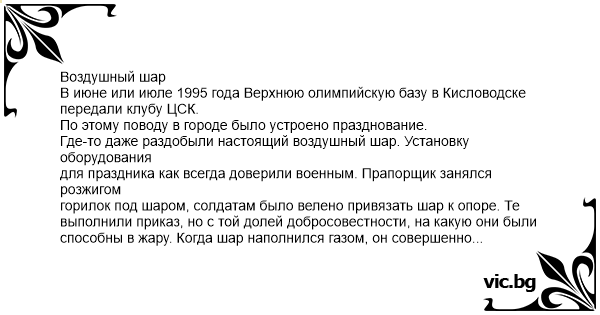 Воздушный шар В июне или июле 1995 года Верхнюю олимпийскую базу в Кисловодске передали клубу ЦСК. По этому поводу в городе было устроено празднование. Где-то даже раздобыли настоящий воздушный шар. Установку оборудования для праздника как всегда доверили военным. Прапорщик занялся розжигом горилок под шаром, солдатам было велено привязать шар к опоре. Те выполнили приказ, но с той долей добросовестности, на какую они были способны в жару. Когда шар наполнился газом, он совершенно естественным образом потянулся вверх. Прапорщик был доволен результатом, улыбался во весь рот, придерживая шар за веревку. И все было бы замечательно, если бы...не развязался узел, сдерживающий шар. Тот мгновенно взмыл на высоту 50 метров вместе с висящим на веревке "пиротехником". Толпа радовалась шоу, а шар поднимался выше и улетал дальше. Радовалось и военное руководство, пока ему деликатно не намекнули, что все не совсем по плану, и товарищ прапорщик может оттуда того...упасть! Тут все, конечно. Засуетились. Тем временем, борющийся за свою жизнь мужик, медленно проплывал мимо поста ГАИ на выезде из города. ГАИшники видели, что человек на веревке зачем-то подпрыгивал, держась за веревку, явно что-то пытаясь сделать. А пытался он зажигать тухнущие горилки зажигалкой, чтобы не свалиться камнем вниз вместе со сдувшимся шаром. Полет закончился падением с 8-метровой высоты небольшими ушибами и большим неврозом.
