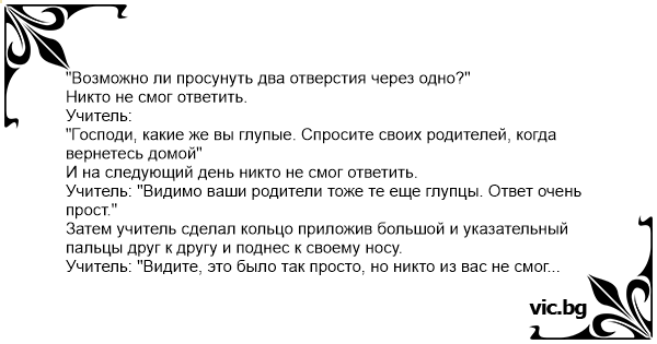 "Возможно ли просунуть два отверстия через одно?" Никто не смог ответить. Учитель: