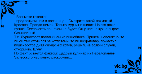 - предложили нам в гостинице. - Смотрите какой лохматый. Красава. Правда немой. Только мурчит и шипит. Но это даже лучше. Беспокоить по ночам не будет. Он у нас на кухне вырос. Смышленый.