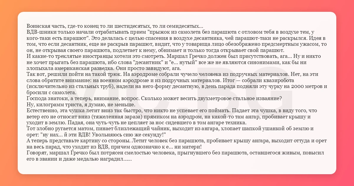 Воинская часть, где-то конец то ли шестидесятых, то ли семидесятых... ВДВ-шники только начали отрабатывать прием "прыжок из самолета без парашюта с отловом тебя в воздухе тем, у кого-таки есть парашют". Это делалась с целью спасения в воздухе десантника, чей парашют-таки не раскрылся. Идея в том, что если десантник, еще не раскрыв парашют, видит, что у товарища лицо обезображено предсмертным ужасом, то он, не открывая своего парашюта, подлетает к нему, обнимает и только тогда открывает свой парашют. И какие-то треклятые иностранцы хотели это смотреть. Маршал Гречко должен был присутствовать, ага... Ну и никто не хочет прыгать без парашюта, ибо слова "десантник" и "е... нутый" все же не являются синонимами, как бы ни злопыхала американская разведка. Они просто завидуют, ага. Так вот, решили пойти на такой трюк. На аэродроме собрали чучело человека из подручных материалов. Нет, на эти слова обратите внимание: на военном аэродроме и из подручных материалов. Итог — собрали квазиробота (исключительно из стальных труб), надели на него форму десантную, в день парада подняли эту чурку на 2000 метров и бросили с самолета. Господа знатоки, а теперь, внимание, вопрос. Сколько может весить двухметровое стальное изваяние? Ну, килограмм триста, я думаю, не меньше. Естественно, эта чушка летит вниз так быстро, что никто не успевает его поймать. Падает эта чушка, в виду того, что ветер его не относит вниз (тяжеленная зараза) прямиком на аэродром, на какой-то там ангар, пробивает крышу и уходит в землю. Падая, она чуть-чуть не цепляет за нос сидевшего в том ангаре техника. Тот злобно ругается матом, пинает близлежащий чайник, выходит из ангара, хлопает шапкой ушанкой об землю и орет: "ну нах... й эти ВДВ! Увольняюсь сию же секунду!" А теперь представьте картину со стороны. Летит человек без парашюта, пробивает крышу ангара, выходит оттуда и орет на весь парад, что уходит из ВДВ, причем однозначно к е... ни матери! Говорят, маршал Гречко был потрясен смелостью человека, прыгнувшего без парашюта, оставшегося живым, повысил его в звании и даже медалью наградил... А то, что он ругался после такого прыжка — ну расстроился человек, ну что ты будешь делать...