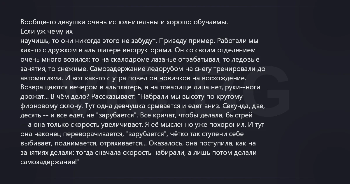 Вообще-то девушки очень исполнительны и хорошо обучаемы. Если уж чему их научишь, то они никогда этого не забудут. Приведу пример. Работали мы как-то с дружком в альплагере инструкторами. Он со своим отделением очень много возился: то на скалодроме лазанье отрабатывал, то ледовые занятия, то снежные. Самозадержание ледорубом на снегу тренировали до автоматизма. И вот как-то с утра повёл он новичков на восхождение. Возвращаются вечером в альплагерь, а на товарище лица нет, руки--ноги дрожат... В чём дело? Рассказывает: "Набрали мы высоту по крутому фирновому склону. Тут одна девчушка срывается и едет вниз. Секунда, две, десять -- и всё едет, не "зарубается". Все кричат, чтобы делала, быстрей -- а она только скорость увеличивает. Я её мысленно уже похоронил. И тут она наконец переворачивается, "зарубается", чётко так ступени себе выбивает, поднимается, отряхивается... Оказалось, она поступила, как на занятиях делали: тогда сначала скорость набирали, а лишь потом делали самозадержание!"