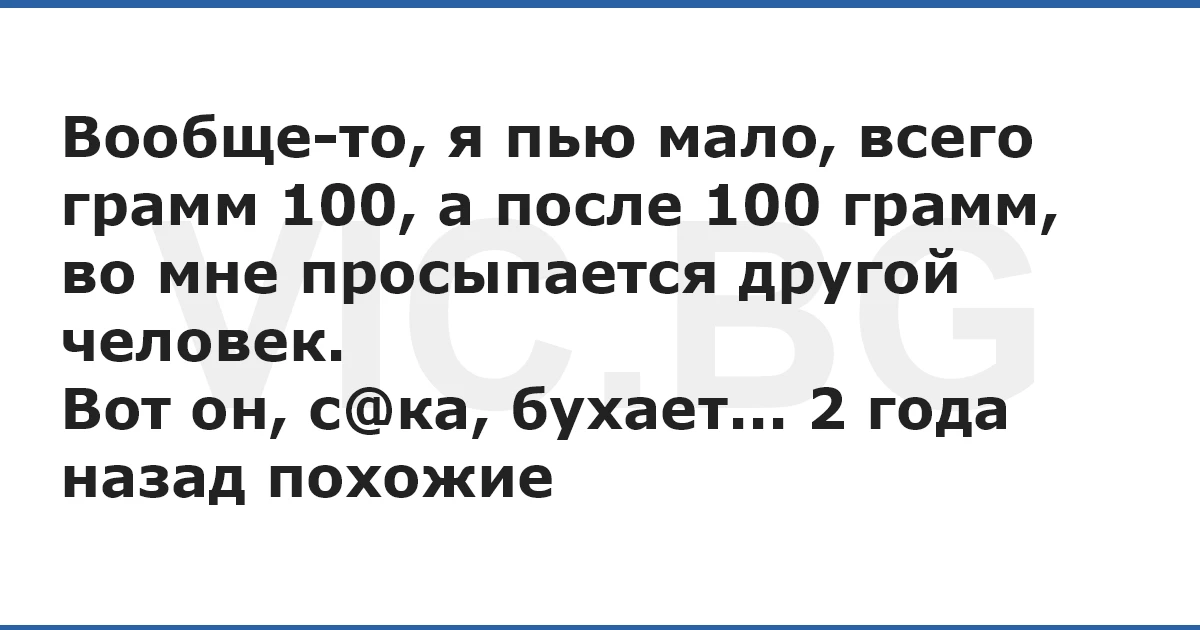 Вообще-то, я пью мало, всего грамм 100, а после 100 грамм, во мне просыпается другой человек. Вот он, с@ка, бухает... 2 года назад похожие