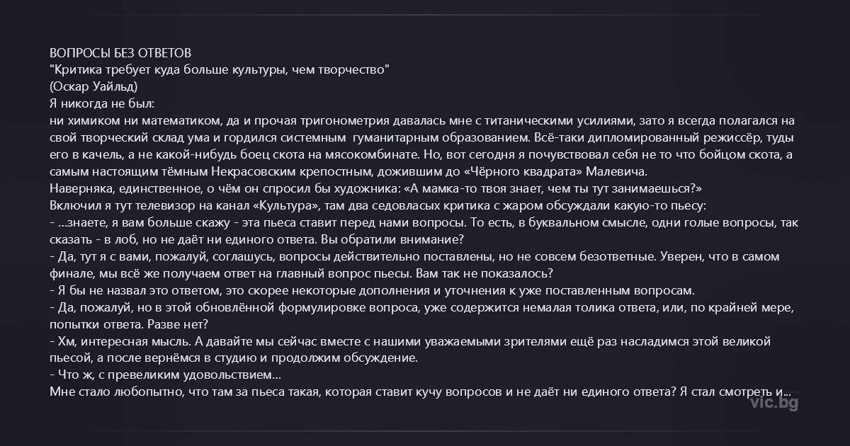 Я никогда не был: ни химиком ни математиком, да и прочая тригонометрия давалась мне с титаническими усилиями, зато я всегда полагался на свой творческий склад ума и гордился системным гуманитарным образованием. Всё-таки дипломированный режиссёр, туды его в качель, а не какой-нибудь боец скота на мясокомбинате. Но, вот сегодня я почувствовал себя не то что бойцом скота, а самым настоящим тёмным Некрасовским крепостным, дожившим до «Чёрного квадрата» Малевича. Наверняка, единственное, о чём он спросил бы художника: «А мамка-то твоя знает, чем ты тут занимаешься?» Включил я тут телевизор на канал «Культура», там два седовласых критика с жаром обсуждали какую-то пьесу: - …знаете, я вам больше скажу - эта пьеса ставит перед нами вопросы. То есть, в буквальном смысле, одни голые вопросы, так сказать - в лоб, но не даёт ни единого ответа. Вы обратили внимание? - Да, тут я с вами, пожалуй, соглашусь, вопросы действительно поставлены, но не совсем безответные. Уверен, что в самом финале, мы всё же получаем ответ на главный вопрос пьесы. Вам так не показалось? - Я бы не назвал это ответом, это скорее некоторые дополнения и уточнения к уже поставленным вопросам. - Да, пожалуй, но в этой обновлённой формулировке вопроса, уже содержится немалая толика ответа, или, по крайней мере, попытки ответа. Разве нет? - Хм, интересная мысль. А давайте мы сейчас вместе с нашими уважаемыми зрителями ещё раз насладимся этой великой пьесой, а после вернёмся в студию и продолжим обсуждение. - Что ж, с превеликим удовольствием… Мне стало любопытно, что там за пьеса такая, которая ставит кучу вопросов и не даёт ни единого ответа? Я стал смотреть и вникать: так, так, какофония настройки симфонического оркестра. Дирижёр, скрипочки, валторны, арфа, литавры, рояль. Замолкли покашливания зрительного зала. Воцарилась тишина. Заиграла музыка. Музыка, музыка, музыка, играет, играет, играет… Твою же мать! Да это ж просто пьеса для фортепиано с оркестром!!! А интересно, матери этих седовласых, знают, чем их дети на жизнь зарабатывают…?