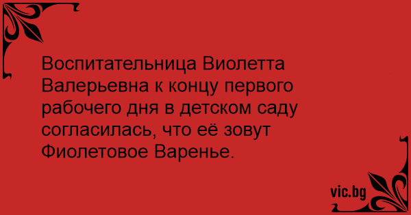 Воспитательница Виолетта Валерьевна к концу первого рабочего дня в детском саду согласилась, что её зовут Фиолетовое Варенье.