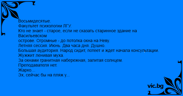 Восьмидесятые. Факультет психологии ЛГУ. Кто не знает - старое, если не сказать старинное здание на Васильевском острове. Огромные - до потолка окна на Неву. Летняя сессия. Июнь. Два часа дня. Душно. Большая аудитория. Народ сидит, потеет и ждет начала консультации. Жужжит ленивая муха. За окнами гранитная набережная, залитая солнцем. Преподавателя нет. Жарко… Эх, сейчас бы на пляж у Петропавловки! В Неву окунуться… Чу! Топот по коридору… Дверь нараспашку! Врывается вечно опаздывающий NN. Милейший человек. Доктор наук. Умница. Но очень невезучий. То пальцы дверью прищемит. Кому! Декану, решившему деликатно заглянуть в щелочку. Гулял NN по аудитории, глядь, а дверь - открыта. Непорядок. Ногой-то дверь и прикрыл. Кстати, оказалось, декан столько интересных слов помнит. С войны наверное! То портфель у NN улетит с третьего этажа в пролет лестничных маршей и хорошо так, громко чпокнет по тыкве некстати замешкавшемуся внизу первокурснику. Кстати, потом этот треснутый сосуд для знаний так быстро-быстро каждый раз пробегал от входной двери до лестницы… С первого раза понял! То прямо во внутреннем дворике факультета питомец павловского института (где собачек режут) ногу ему на лоскутья распустит. И ведь - именно ему! Хотя дразнил собаку вовсе не он. А совсем даже другой, умный и потому - быстро смывшийся со двора чел. А NN просто мимо проходил… А собаке что, все едино! Хвать и - за ногу! Крепко так. Фиг их там знает, чего эти последователи академика Павлова в бОшку ей зашили?! Только сильно агрессивный получился зверь. Сильно! Еле оттащили. Она NN по всему двору, как апорт таскала. Пока арматуриной подвернувшейся по репе не получила. Само собой - эксперимент насмарку! NN-у приехавшая «Скорая» -вот такенным! шприцем укол закатила и в больничку увезла. На пару месяцев. Невезучий, одно слово. Ну и вот. Залетает он в аудиторию. И выдает единым махом, направляясь бегом от дверей к кафедре: «Все-уже-собрались-как-замечательно-начнем-пожалуй-думаю-вы-не-будете-возражать…» Достигнув преподавательского места, хватает за ручку окно и! Резко рвет его на себя! Наверное, он хотел проветрить душное помещение… «Не-будуте-возражать-если-я…» Огромная рама, закрытая на какой-то древний и очень прочный шпингалет СВЕРХУ, но - свободная от шпингалета ВНИЗУ…. Дергается… Искривляется… И стеклянный водопад обрушивается вниз! Прямо на NN! Женская часть курса заверещала во всю мощь своих слабых децибелов. А юноши, наслаждаясь и искренне завидуя редкой хулиганской удаче - одним рывком - все стекла! - заорали: - Нет, не будем возражать! И остальные - на фиг! Жарко! Когда шум и визг затих, в наступившей тишине NN хриплым голосом закончил свою мысль «Не-будете-возражать-если-я-начну-консультацию? » Сема Помидоров