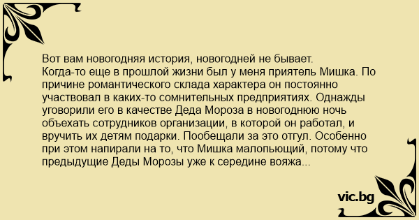 Когда-то еще в прошлой жизни был у меня приятель Мишка. По причине романтического склада характера он постоянно участвовал в каких-то сомнительных предприятиях. Однажды уговорили его в качестве Деда Мороза в новогоднюю ночь объехать сотрудников организации, в которой он работал, и вручить их детям подарки. Пообещали за это отгул. Особенно при этом напирали на то, что Мишка малопьющий, потому что предыдущие Деды Морозы уже к середине вояжа были «в хлам». Снабдили его для этой операции дедморозовской амуницией, мешком с подарками, автомобилем УАЗ-469 с шофером и Снегурочкой. Снегурочка имела возраст слегка за тридцать и внешность, позволяющую играть молодую Бабу-Ягу, не гримируясь. Но так как других претенденток не было, пришлось брать, что дают.