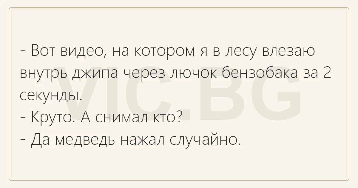 - Вот видео, на котором я в лесу влезаю внутрь джипа через лючок бензобака за 2 секунды. - Круто. А снимал кто? - Да медведь нажал случайно.