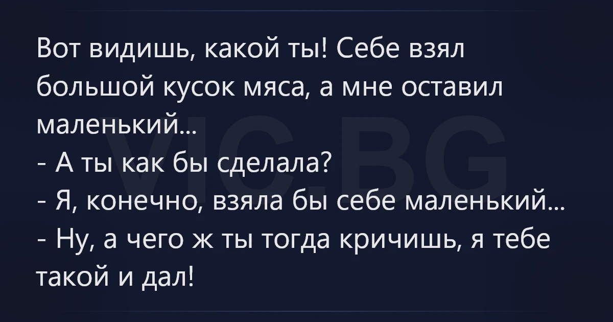 Вот видишь, какой ты! Себе взял большой кусок мяса, а мне оставил маленький... - А ты как бы сделала? - Я, конечно, взяла бы себе маленький... - Ну, а чего ж ты тогда кричишь, я тебе такой и дал!
