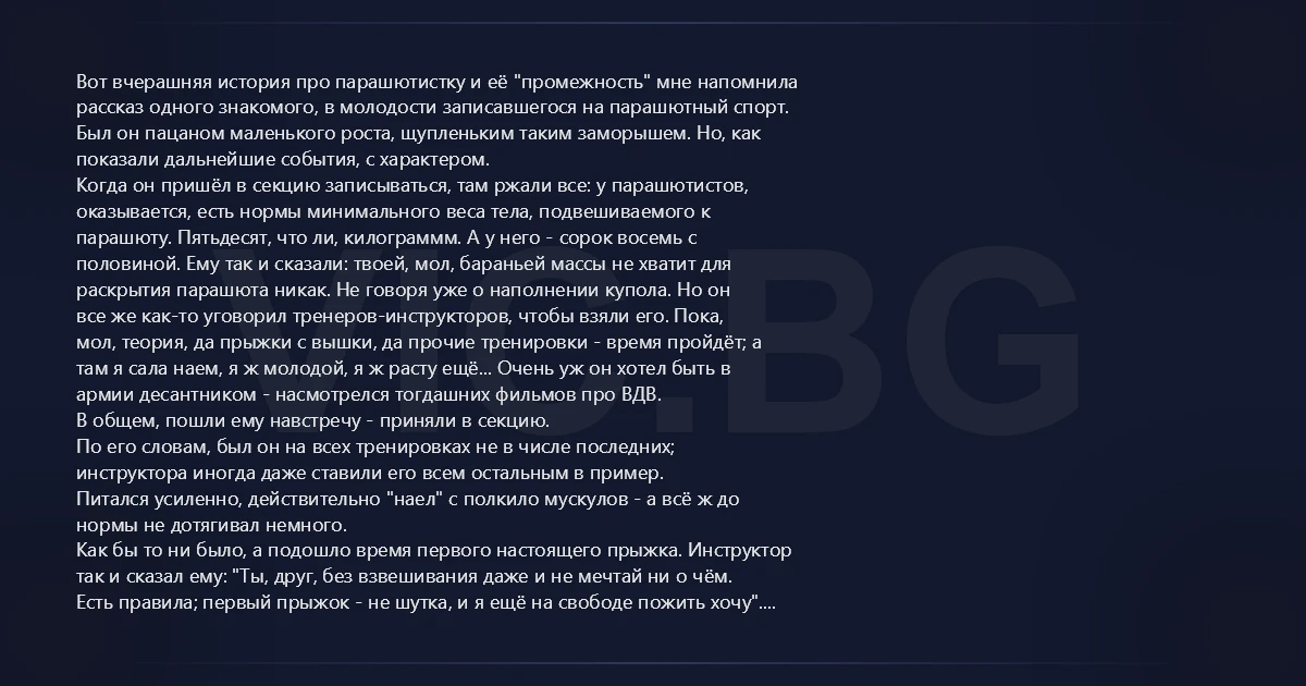 Вот вчерашняя история про парашютистку и её "промежность" мне напомнила рассказ одного знакомого, в молодости записавшегося на парашютный спорт. Был он пацаном маленького роста, щупленьким таким заморышем. Но, как показали дальнейшие события, с характером. Когда он пришёл в секцию записываться, там ржали все: у парашютистов, оказывается, есть нормы минимального веса тела, подвешиваемого к парашюту. Пятьдесят, что ли, килограммм. А у него - сорок восемь с половиной. Ему так и сказали: твоей, мол, бараньей массы не хватит для раскрытия парашюта никак. Не говоря уже о наполнении купола. Но он все же как-то уговорил тренеров-инструкторов, чтобы взяли его. Пока, мол, теория, да прыжки с вышки, да прочие тренировки - время пройдёт; а там я сала наем, я ж молодой, я ж расту ещё... Очень уж он хотел быть в армии десантником - насмотрелся тогдашних фильмов про ВДВ. В общем, пошли ему навстречу - приняли в секцию. По его словам, был он на всех тренировках не в числе последних; инструктора иногда даже ставили его всем остальным в пример. Питался усиленно, действительно "наел" с полкило мускулов - а всё ж до нормы не дотягивал немного. Как бы то ни было, а подошло время первого настоящего прыжка. Инструктор так и сказал ему: "Ты, друг, без взвешивания даже и не мечтай ни о чём. Есть правила; первый прыжок - не шутка, и я ещё на свободе пожить хочу". Ну, что было парню делать? Перед взвешиванием выдул он, одну за другой, шесть бутылок лимонада "Дюшес". Еле-еле - так он рассказывал - влезло. Прошёл взвешивание - норму даже превысил чуть-чуть. А дальше начался сущий кошмар: пока - парашюты; пока - самолёт; пока взлетели, пока высоту набрали... Инструктор, говорит, мне что-то перед прыжком толкует, а у меня так на пузырь давит, что аж в глазах булькает. Не помню, говорит, как из самолёта сиганул. Первый раз обоссался ещё в воздухе. Второй раз - уже на земле, пока парашют усмирял... А в остальном, говорит, в общем, всё было, как и ожидал от первого прыжка: состояние - эйфория напополам с облегчением. Выстроли, мол, нас после, когда все отпрыгались - а у меня "промежность" до самых ботинок мокрая. Ну, ржали, конечно... Я - рассказывает - и не пытался даже обьяснить, что к чему. Боялся, что из секции за обман выгонят... Да ещё и то меня немного успокоило, что ржали не над одним мной: в строю оказался ещё один с мокрой "промежностью" - здоровый восьмидесятикилограммовый бугай...
