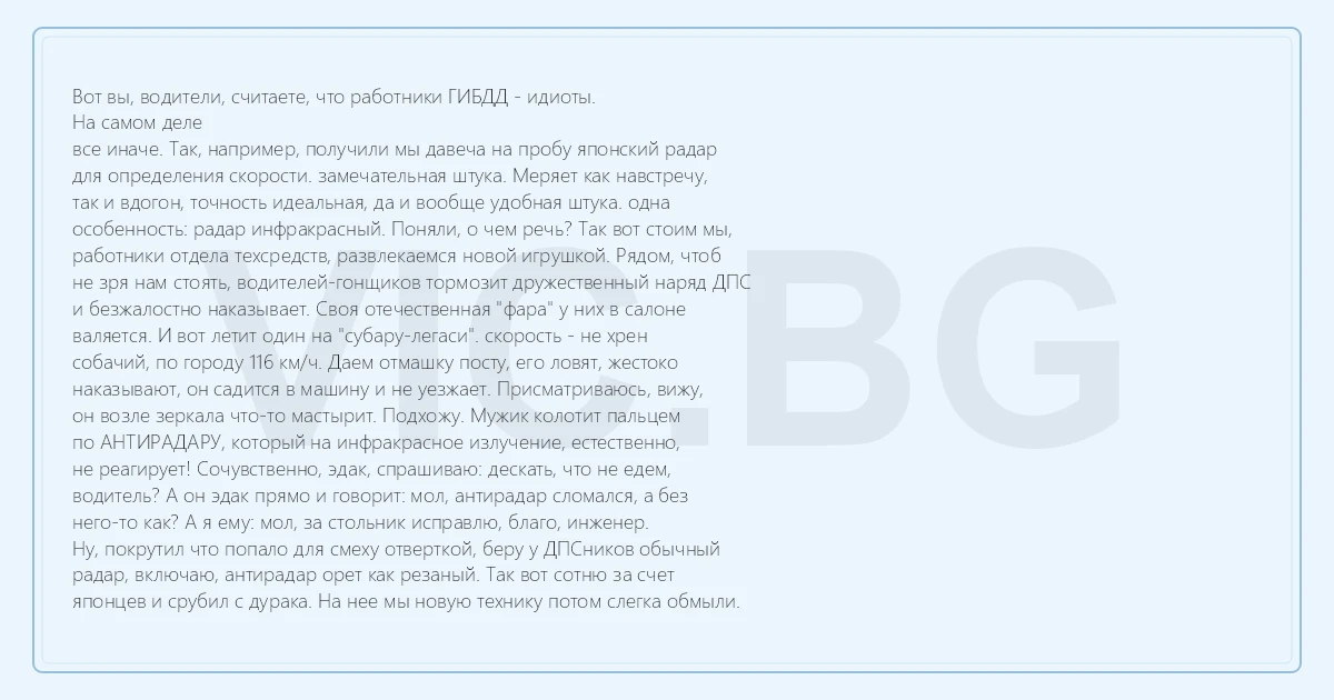 Вот вы, водители, считаете, что работники ГИБДД - идиоты. На самом деле все иначе. Так, например, получили мы давеча на пробу японский радар для определения скорости. замечательная штука. Меряет как навстречу, так и вдогон, точность идеальная, да и вообще удобная штука. одна особенность: радар инфракрасный. Поняли, о чем речь? Так вот стоим мы, работники отдела техсредств, развлекаемся новой игрушкой. Рядом, чтоб не зря нам стоять, водителей-гонщиков тормозит дружественный наряд ДПС и безжалостно наказывает. Своя отечественная "фара" у них в салоне валяется. И вот летит один на "субару-легаси". скорость - не хрен собачий, по городу 116 км/ч. Даем отмашку посту, его ловят, жестоко наказывают, он садится в машину и не уезжает. Присматриваюсь, вижу, он возле зеркала что-то мастырит. Подхожу. Мужик колотит пальцем по АНТИРАДАРУ, который на инфракрасное излучение, естественно, не реагирует! Сочувственно, эдак, спрашиваю: дескать, что не едем, водитель? А он эдак прямо и говорит: мол, антирадар сломался, а без него-то как? А я ему: мол, за стольник исправлю, благо, инженер. Ну, покрутил что попало для смеху отверткой, беру у ДПСников обычный радар, включаю, антирадар орет как резаный. Так вот сотню за счет японцев и срубил с дурака. На нее мы новую технику потом слегка обмыли.