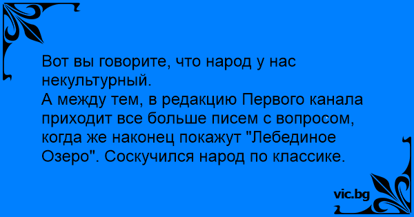 А между тем, в редакцию Первого канала приходит все больше писем с вопросом, когда же наконец покажут "Лебединое Озеро". Соскучился народ по классике.