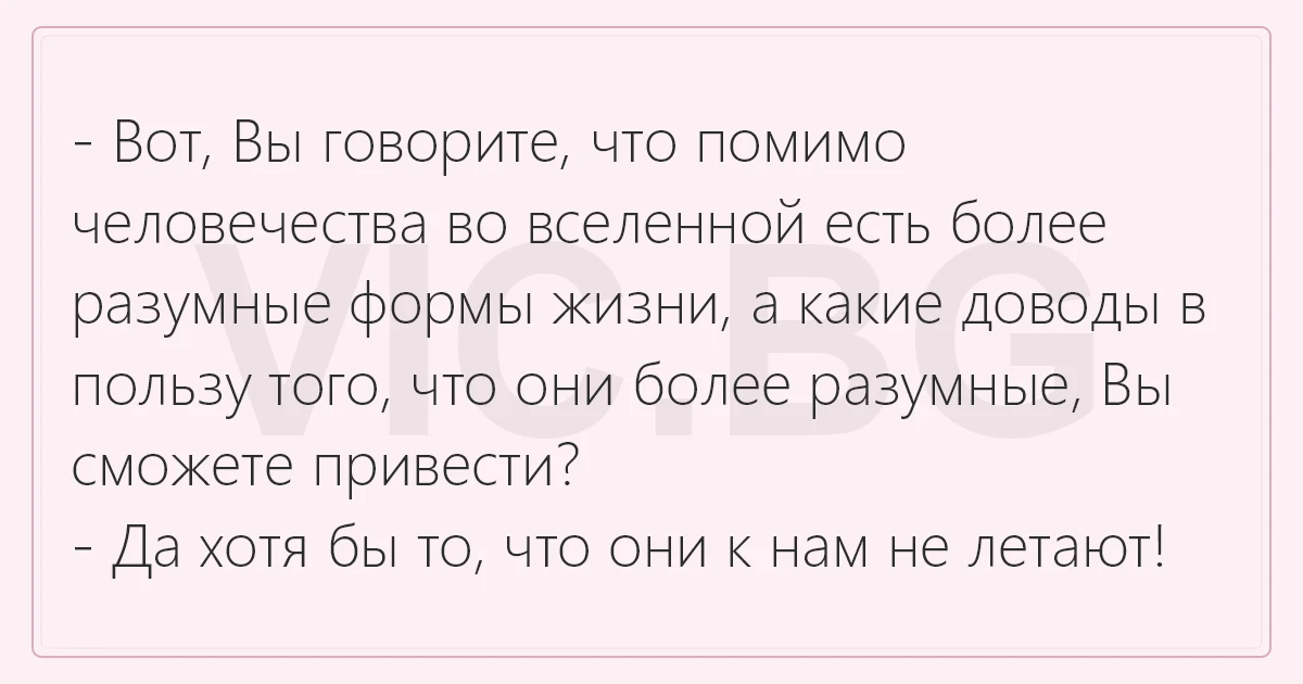 - Вот, Вы говорите, что помимо человечества во вселенной есть более разумные формы жизни, а какие доводы в пользу того, что они более разумные, Вы сможете привести? - Да хотя бы то, что они к нам не летают!