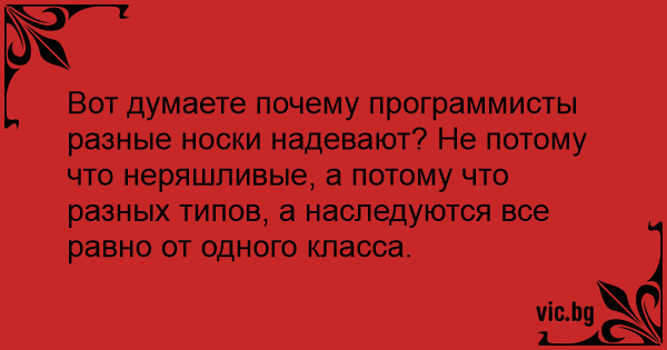 Вот думаете почему программисты разные носки надевают? Не потому что неряшливые, а потому что разных типов, а наследуются все равно от одного класса.