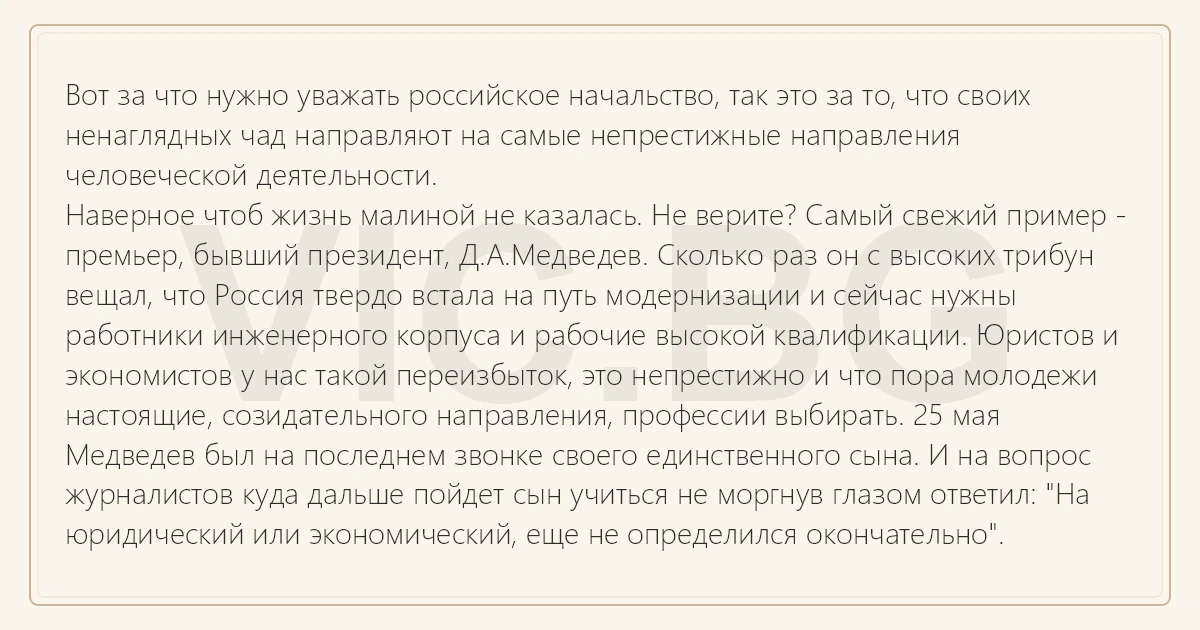Вот за что нужно уважать российское начальство, так это за то, что своих ненаглядных чад направляют на самые непрестижные направления человеческой деятельности. Наверное чтоб жизнь малиной не казалась. Не верите? Самый свежий пример - премьер, бывший президент, Д.А.Медведев. Сколько раз он с высоких трибун вещал, что Россия твердо встала на путь модернизации и сейчас нужны работники инженерного корпуса и рабочие высокой квалификации. Юристов и экономистов у нас такой переизбыток, это непрестижно и что пора молодежи настоящие, созидательного направления, профессии выбирать. 25 мая Медведев был на последнем звонке своего единственного сына. И на вопрос журналистов куда дальше пойдет сын учиться не моргнув глазом ответил: "На юридический или экономический, еще не определился окончательно".