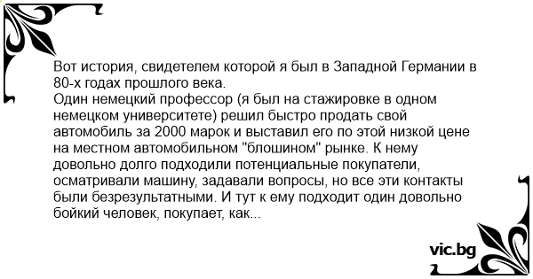 Один немецкий профессор (я был на стажировке в одном немецком университете) решил быстро продать свой автомобиль за 2000 марок и выставил его по этой низкой цене на местном автомобильном "блошином" рынке. К нему довольно долго подходили потенциальные покупатели, осматривали машину, задавали вопросы, но все эти контакты были безрезультатными. И тут к ему подходит один довольно бойкий человек, покупает, как говорится, не глядя машину, меняет на ней ценник и тут же на глазах изумленного профессора перепродает ее за 4000 марок... Этот перекупщик мог правильно оценить стоимость подержанного автомобиля и понимал, что заниженная цена так же плоха для торга, как и завышенная.
