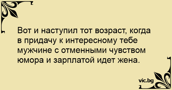 Вот и наступил тот возраст, когда в придачу к интересному тебе мужчине с отменными чувством юмора и зарплатой идет жена.