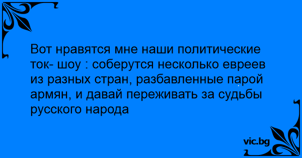 Вот нравятся мне наши политические ток- шоу : соберутся несколько евреев из разных стран, разбавленные парой армян, и давай переживать за судьбы русского народа