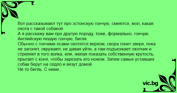 Не то бигль. С ними охотятся на зайцев или кроликов, и задача этой собаки - привести к зверю идущего пешком хозяина, при этом не слишком пугая и без того нервное животное. Поэтому бигли - маленькие и очень звонкоголосые. По пронзительности гавканья они могут дать фору даже мелкой псинке моей соседки-пенсионерки, а ту, когда радуется, слышно в соседнем подъезде. Бегают они тоже не слишком быстро - а какой смысл бегать быстро, если хозяин сзади шлёпает с ружьём по грязи и ускориться сможет, только отбросив в качестве первой ступени ружьё, а в качестве второй - сапоги, но тогда зайца прибить будет уже нечем.