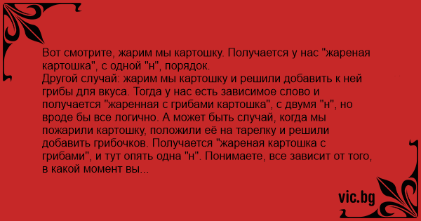 Другой случай: жарим мы картошку и решили добавить к ней грибы для вкуса. Тогда у нас есть зависимое слово и получается "жаренная с грибами картошка", с двумя "н", но вроде бы все логично. А может быть случай, когда мы пожарили картошку, положили её на тарелку и решили добавить грибочков. Получается "жареная картошка с грибами", и тут опять одна "н". Понимаете, все зависит от того, в какой момент вы добавили грибы.