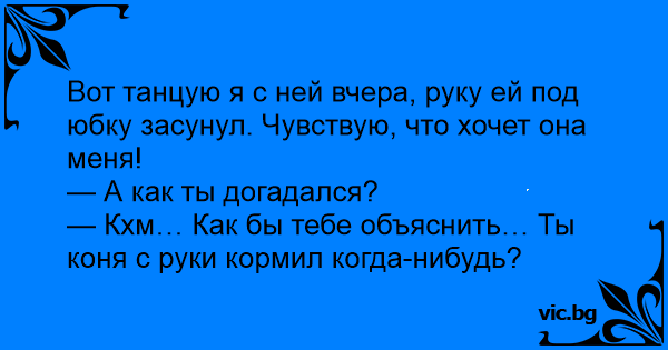 Вот танцую я с ней вчера, руку ей под юбку засунул. Чувствую, что хочет она меня!