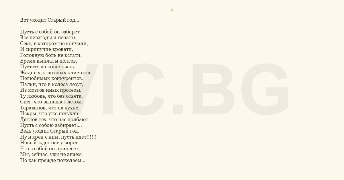 Вот уходит Старый год... . Пусть с собой он заберет Все невзгоды и печали, Секс, в котором не кончали, И скрипучие кровати, Головную боль не кстати. Бремя выплаты долгов, Пустоту из кошельков, Жадных, кляузных клиентов, Нелюбимых конкурентов. Палки, что в колеса лезут, Из мозгов иных протезы. Ту любовь, что без ответа, Снег, что выпадает летом. Тараканов, что на кухне, Искры, что уже потухли, Дятлов тех, что нас долбают, Пусть с собою забирает.... Ведь уходит Старый год. Ну и хpeн с ним, пусть идет!!!!!! Новый ждет нас у ворот. Что с собой он принесет, Мы, сейчас, увы не знаем, Но как прежде пожелаем В Новом мы себе Году С неба яркую звезду, (что согреет, не сожжет). С полки вкусный пирожок, Исполнения желаний, Обретенья новых знаний, Мудрым стать, но не стареть. Не спеша везде успеть, Удовольствия во всем - Ночью темной, светлым днем, В расслаблении, в труде, Где б мы небыли - везде! И любви - большей, огромной, Яркой, страстной, нежной, томной, И обычной, и не очень.... Так же вовремя закончить То, что начато давно, Много раз сходить в кино, Наконец - то отоспаться, От рутины оторваться, Новых обрести друзей, Целей достигать быстрей, Приключений безопасных, Вовремя предохранятся, Никогда не залетать, Но парить, летать, летать!! И узнать, что значит Счастье, Верность, Дружба и Участье, Оптимизм, Энтузиазм, Мудрость, Слава и Оргазм... В общем, много нам не нужно. Главное, чтоб стало лучше. Новый год, не подведи, Дверь открыта, заходи!!!