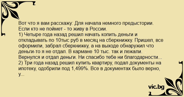 1) Четыре года назад решил начать копить деньги и откладывать по 10тыс руб в месяц на сберкнижку. Пришел, все оформили, забрал сберкнижку, а на выходе обнаружил что деньги-то я не отдал. В кармане 10 тыс. так и лежали. Вернулся и отдал деньги. Ни спасибо тебе ни благодарности...