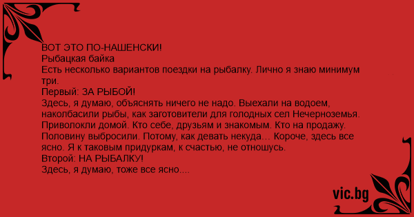 Здесь, я думаю, объяснять ничего не надо. Выехали на водоем, наколбасили рыбы, как заготовители для голодных сел Нечерноземья. Приволокли домой. Кто себе, друзьям и знакомым. Кто на продажу. Половину выбросили. Потому, как девать некуда… Короче, здесь все ясно. Я к таковым придуркам, к счастью, не отношусь.