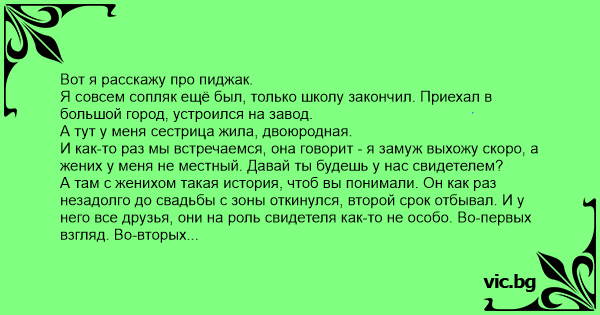 Вот я расскажу про пиджак. Я совсем сопляк ещё был, только школу закончил. Приехал в большой город, устроился на завод. А тут у меня сестрица жила, двоюродная. И как-то раз мы встречаемся, она говорит - я замуж выхожу скоро, а жених у меня не местный. Давай ты будешь у нас свидетелем? А там с женихом такая история, чтоб вы понимали. Он как раз незадолго до свадьбы с зоны откинулся, второй срок отбывал. И у него все друзья, они на роль свидетеля как-то не особо. Во-первых взгляд. Во-вторых они при слове свидетель вздрагивают, замыкаются, и уходят в глухую несознанку. И наконец, у них же у всех вместо паспорта справка об освобождении. Я говорю - конечно! Давай. Неудобно же сестре отказать, правильно? А сам про себя думаю - блин! А что хоть там делать-то нужно, свидетелем? А сестрица мне - не переживай. Делать тебе ничего будет не надо. У тебя такая свидетельница будет, она всё сделает, ты только сиди и улыбайся. И всё. Не, ну так-то конечно. Если просто сидеть и улыбаться, то я согласен. Ну, так и решили. И осталась только одна проблема. Костюм. У меня не было костюма. Ну, то есть конечно дома он где-то был. Но не ехать же пол-страны за костюмом? Зато у меня был отличный черный кожаный пиджак. Как раз тогда модно было. И я думаю - да фиг ли костюм? Надену пиджак кожаный, рубаху новую, галстук, штаны приличные, и буду кум королю. Так решил, так сделал. И вот идёт свадьба. Ну, что это была за свадьба, это надо отдельно рассказывать. Сейчас не об этом. Идёт свадьба значит, был арендован зал специальный, не кафе, а просто какое-то большое помещение. Жених, невеста, народу человек шестьдесят, и я такой, в черном кожаном пинджаке, с красной лентой. Красив неимоверно просто! Мне сестрица потом, посреди застолья, наклоняется, смеётся, и говорит: - Слушай, ты в этом своём пиджаке, как чекист на свадьбе у буржуев. Сделай лицо попроще. А то вон Валеркины дружки на тебя косятся. Ну ладно. Свадьба идёт, все пьют, гуляют, веселятся, я сижу, улыбаюсь. Как велели. И тут значит наступает очередь подарков. Как заведено. Свидетельница встала, и объявила, что вот сейчас, кто если хочет, может поздравить молодых. И началась церемония вручения подарков. Сперва родители с одной стороны, потом с другой... Ну, вы в курсе короче. И вот дарят подарки, невеста с женихом стоят, и принимают. И передают мне. А я стою, и складирую их там аккуратно сзади. А лучший подарок молодым, вы знаете, это конверт с деньгами. И каждый считай второй, а то и чаще, стоит с конвертом. И конверты невеста тоже берёт, и передает мне. И я складываю их аккуратно в карман. Внутренний левый. Черного кожаного пиджака. Ну вот, всё это, торжественная часть закончилась, и свадьба запела и заплясала, как водится, постепенно съезжая с рельсов. Тут и мне работы подвалило. То драку разнимать, то невесту у меня украли и я бегал с выкупом высунув язык, то гармониста из-под стола доставал два раза. И взопрел. Жарко. Пиджак снял, и повесил на спинку стула. И у меня его спиздили! Представляете? То есть вот всё хорошо, висел-висел пиджак, я сигареты из него брал периодически, а в один определённый момент хвать! А пиджака нету. Ещё была слабая надежда, что кто-то просто надел. Или пошутил. Но нет. Поискали, поспрашивали, нет. Никто ничего. И хpeн бы с ним с пиджаком. Но ведь все до единого конверты в левом внутреннем, с подарочными деньгами, а это сумма немаленькая... Понимаете, 