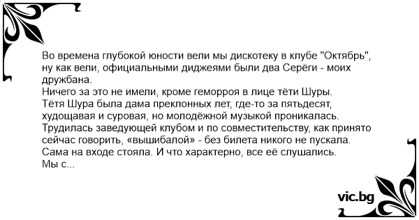 Во времена глубокой юности вели мы дискотеку в клубе "Октябрь", ну как вели, официальными диджеями были два Серёги - моих дружбана. Ничего за это не имели, кроме геморроя в лице тёти Шуры. Тётя Шура была дама преклонных лет, где-то за пятьдесят, худощавая и суровая, но молодёжной музыкой проникалась. Трудилась заведующей клубом и по совместительству, как принято сейчас говорить, «вышибалой» - без билета никого не пускала. Сама на входе стояла. И что характерно, все её слушались. Мы с пацанами приходили задолго до дискотеки, часа за полтора, звук настроить, втроём оторваться под "Металлику" в пока ещё пустом зале, поскольку не всем такая музыка по нраву. Ну и выпить немного, какая дискотека без этого. Через некоторое время являлась тётя Шура, смотря на нас, как Ленин на буржуазию, подходила ко мне и спрашивала (орала) сквозь децибелы: - Дай закурить! Пацаны конечно смеялись. Тётя Шура потом с этой шуткой от меня отстала. Почти. Но так как-то интересно посматривала и я это чувствовал. Декабрь, почти уже Новый год. Начало дискотеки. В зале не люблю курить, хотя можно. Выхожу через тётю Шуру на улицу. Закуриваю. На улице красота, большими хлопьями тихо падает снег. Молодёжная суббота в самом разгаре. Стою спиной ко входу, слышу, открылась дверь и ко мне кто-то подбирается, негромко похрустывая снегом. - Дай закурить! - чей-то знакомый голос. Поворачиваюсь… - Тётя Шура, блин горелый! Но закурить дал. Стоим, курим. - У нас на фабрике дед Мороз скончался, - как бы между делом говорит она. - Соболезную, - отвечаю я. - Ты меня не понял, - говорит она. И глубоко затягивается сигаретой. - Тридцатого числа приходишь ко мне, я тебе даю костюм, бороду...в общем, нужно будет сходить поздравить начальство. Ох нихрена себе, подумалось мне. Но вслух сказал: - А кто Снегурочка? - Я! - отвечает тётя Шура, не вынимая сигарету изо рта. - Чоёёё!? - вырвалось у меня. Тётя Шура невозмутимо: - В общем так, пионер, тридцатого к девяти не придёшь - к клубу больше не подходи! __________________ Я пришёл тридцатого, одел костюм, бороду, пошёл с тёть Шурой поздравлять начальство. Смеялись все. Так как такой Снегурочки, как у меня, больше ни у кого не было - эксклюзив, лимитед идишн. На этом, внезапно свалившемся на меня мероприятии, я даже немного заработал. Свою первую "Снегурку" не забуду никогда и вспоминаю с теплотой).