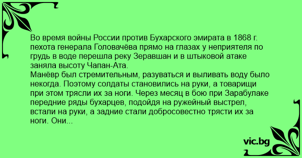 Во время войны России против Бухарского эмирата в 1868 г. пехота генерала Головачёва прямо на глазах у неприятеля по грудь в воде перешла реку Зеравшан и в штыковой атаке заняла высоту Чапан-Ата.