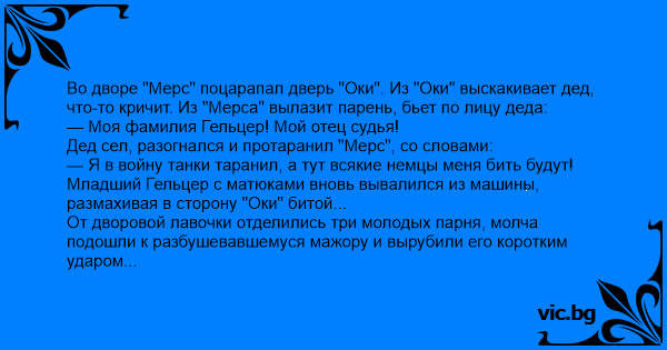 Во дворе "Мерс" поцарапал дверь "Оки". Из "Оки" выскакивает дед, что-то кричит. Из "Мерса" вылазит парень, бьет по лицу деда: