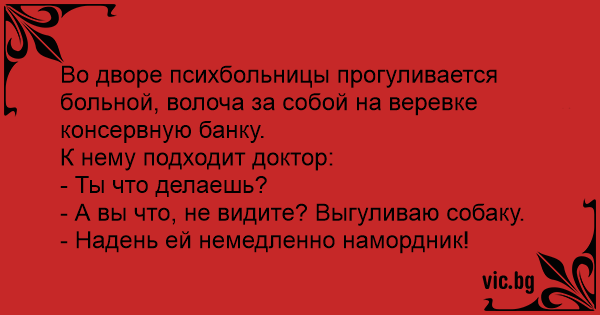 Во дворе психбольницы прогуливается больной, волоча за собой на веревке консервную банку.