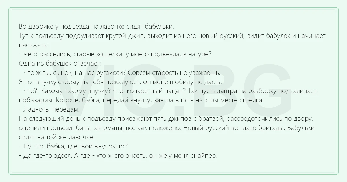 Во дворике у подъезда на лавочке сидят бабульки. Тут к подъезду подруливает крутой джип, выходит из него новый русский, видит бабулек и начинает наезжать: - Чего расселись, старые кошелки, у моего подъезда, в натуре? Одна из бабушек отвечает: - Что ж ты, сынок, на нас ругаисси? Совсем старость не уважаешь. Я вот внучку своему на тебя пожалуюсь, он мене в обиду не дасть. - Что?! Какому-такому внучку? Что, конкретный пацан? Так пусть завтра на разборку подваливает, побазарим. Короче, бабка, передай внучку, завтра в пять на этом месте стрелка. - Ладноть, передам. На следующий день к подъезду приезжают пять джипов с братвой, рассредоточились по двору, оцепили подъезд, биты, автоматы, все как положено. Новый русский во главе бригады. Бабульки сидят на той же лавочке. - Ну что, бабка, где твой внучок-то? - Да где-то здеся. А где - хто ж его знаеть, он же у меня снайпер.