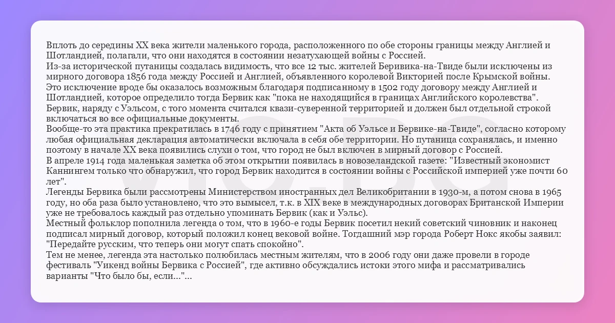 Вплоть до середины XX века жители маленького города, расположенного по обе стороны границы между Англией и Шотландией, полагали, что они находятся в состоянии незатухающей войны с Россией. Из-за исторической путаницы создалась видимость, что все 12 тыс. жителей Беривика-на-Твиде были исключены из мирного договора 1856 года между Россией и Англией, объявленного королевой Викторией после Крымской войны. Это исключение вроде бы оказалось возможным благодаря подписанному в 1502 году договору между Англией и Шотландией, которое определило тогда Бервик как "пока не находящийся в границах Английского королевства". Бервик, наряду с Уэльсом, с того момента считался квази-суверенной территорией и должен был отдельной строкой включаться во все официальные документы. Вообще-то эта практика прекратилась в 1746 году с принятием "Акта об Уэльсе и Бервике-на-Твиде", согласно которому любая официальная декларация автоматически включала в себя обе территории. Но путаница сохранялась, и именно поэтому в начале XX века появились слухи о том, что город не был включен в мирный договор с Россией. В апреле 1914 года маленькая заметка об этом открытии появилась в новозеландской газете: "Известный экономист Каннингем только что обнаружил, что город Бервик находится в состоянии войны с Российской империей уже почти 60 лет". Легенды Бервика были рассмотрены Министерством иностранных дел Великобритании в 1930-м, а потом снова в 1965 году, но оба раза было установлено, что это вымысел, т.к. в XIX веке в международных договорах Британской Империи уже не требовалось каждый раз отдельно упоминать Бервик (как и Уэльс). Местный фольклор пополнила легенда о том, что в 1960-е годы Бервик посетил некий советский чиновник и наконец подписал мирный договор, который положил конец вековой войне. Тогдашний мэр города Роберт Нокс якобы заявил: "Передайте русским, что теперь они могут спать спокойно". Тем не менее, легенда эта настолько полюбилась местным жителям, что в 2006 году они даже провели в городе фестиваль "Уикенд войны Бервика с Россией", где активно обсуждались истоки этого мифа и рассматривались варианты "Что было бы, если..." "Да кто мы такие, чтобы вдруг взять и положить сейчас конец этому замечательному мифу?" - задавался вопросом один из организаторов того фестиваля.
