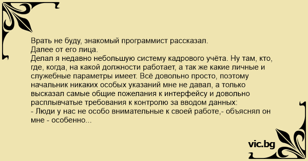 - Люди у нас не особо внимательные к своей работе,- объяснял он мне - особенно молодые девочки, которые в основном по кадрам и работают. Они не будут особенно вчитываться в то, что написано на экране, а будут вводить данные часто не туда и ещё чаще неправильно. Поэтому надо, чтобы поля для ввода различались не только названием, но и цветом. К примеру, поле для ФИО можно сделать белым, для номера телефона синим, а для даты рождения зелёным. А чтобы не писалось разных ляпов, надо сделать логический контроль. К примеру, дата рождения должна контролироваться так, чтобы возраст был где-то в пределах от 20 до 70. Конечно, могут быть отдельные случаи, когда значения будут выходить за эти пределы, но программа в такой ситуации должна мягко предупреждать оператора и жёстко требовать подтверждения, что это не случайная описка.