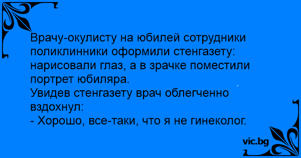 Врачу-окулисту на юбилей сотрудники поликлинники оформили стенгазету: нарисовали глаз, а в зрачке поместили портрет юбиляра.