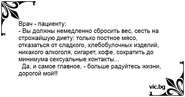 Лікар — пацієнту: — Ви повинні негайно скинути вагу, сісти на строгу дієту: пісне м'ясо, відмовитися від солодкого, виробів хлібобулочних, ніякого алкоголю, сигарет, кави, скоротити до мінімуму...