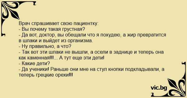 - Так вот эти шлаки не вышли, а осели в заднице и теперь она как каменная!!!... А тут еще эти дети!