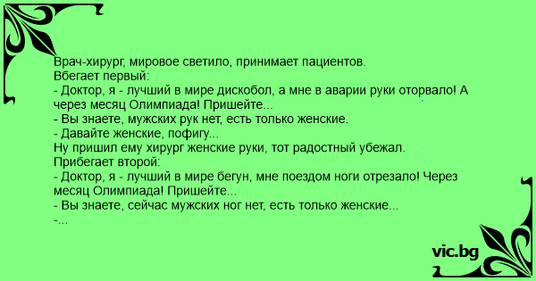 - Доктор, я - лучший в мире дискобол, а мне в аварии руки оторвало! А через месяц Олимпиада! Пришейте...