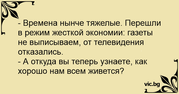 - Времена нынче тяжелые. Перешли в режим жесткой экономии: газеты не выписываем, от телевидения отказались.