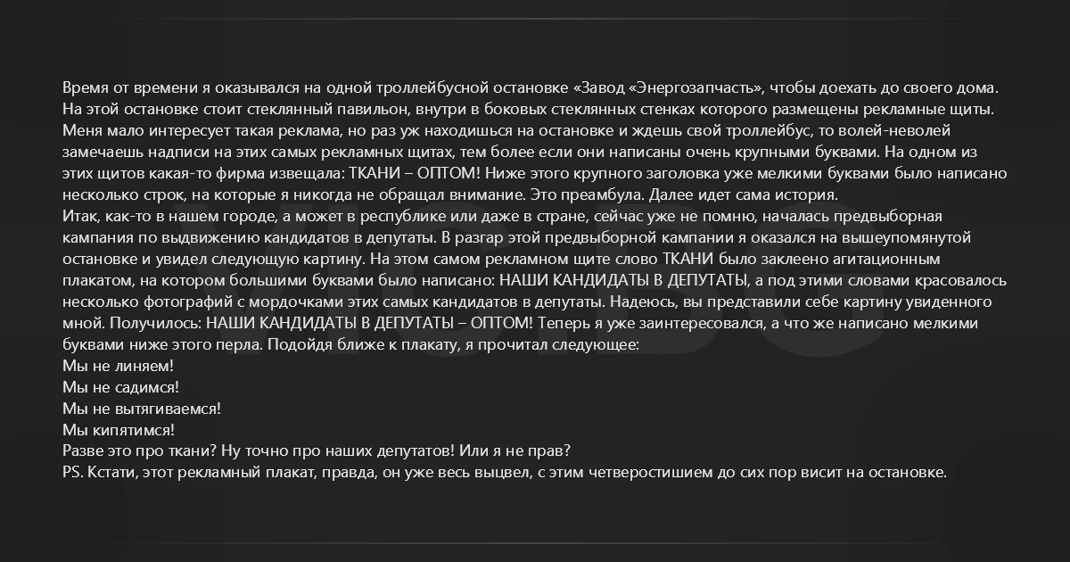 Время от времени я оказывался на одной троллейбусной остановке «Завод «Энергозапчасть», чтобы доехать до своего дома. На этой остановке стоит стеклянный павильон, внутри в боковых стеклянных стенках которого размещены рекламные щиты. Меня мало интересует такая реклама, но раз уж находишься на остановке и ждешь свой троллейбус, то волей-неволей замечаешь надписи на этих самых рекламных щитах, тем более если они написаны очень крупными буквами. На одном из этих щитов какая-то фирма извещала: ТКАНИ – ОПТОМ! Ниже этого крупного заголовка уже мелкими буквами было написано несколько строк, на которые я никогда не обращал внимание. Это преамбула. Далее идет сама история. Итак, как-то в нашем городе, а может в республике или даже в стране, сейчас уже не помню, началась предвыборная кампания по выдвижению кандидатов в депутаты. В разгар этой предвыборной кампании я оказался на вышеупомянутой остановке и увидел следующую картину. На этом самом рекламном щите слово ТКАНИ было заклеено агитационным плакатом, на котором большими буквами было написано: НАШИ КАНДИДАТЫ В ДЕПУТАТЫ, а под этими словами красовалось несколько фотографий с мордочками этих самых кандидатов в депутаты. Надеюсь, вы представили себе картину увиденного мной. Получилось: НАШИ КАНДИДАТЫ В ДЕПУТАТЫ – ОПТОМ! Теперь я уже заинтересовался, а что же написано мелкими буквами ниже этого перла. Подойдя ближе к плакату, я прочитал следующее: Мы не линяем! Мы не садимся! Мы не вытягиваемся! Мы кипятимся! Разве это про ткани? Ну точно про наших депутатов! Или я не прав? PS. Кстати, этот рекламный плакат, правда, он уже весь выцвел, с этим четверостишием до сих пор висит на остановке.